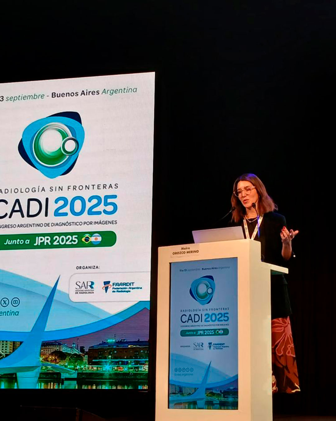 Durante el congreso, la Dra. Alés brindó una conferencia sobre “Fístulas arteriovenosas durales intracraneales”, en el área de Neurorradiología Intervencionista, mientras que la Dra. Orozco expuso sobre “Nódulos subsólidos: evaluación, seguimiento y decisiones clínicas”, en el módulo de Tórax.