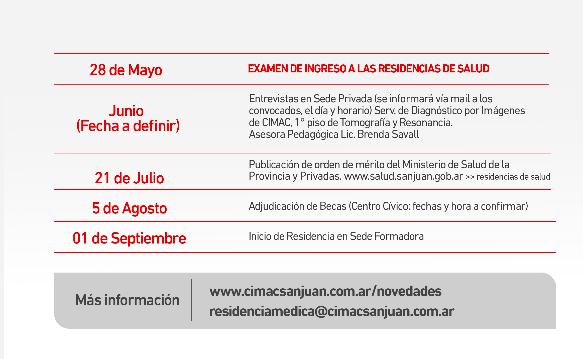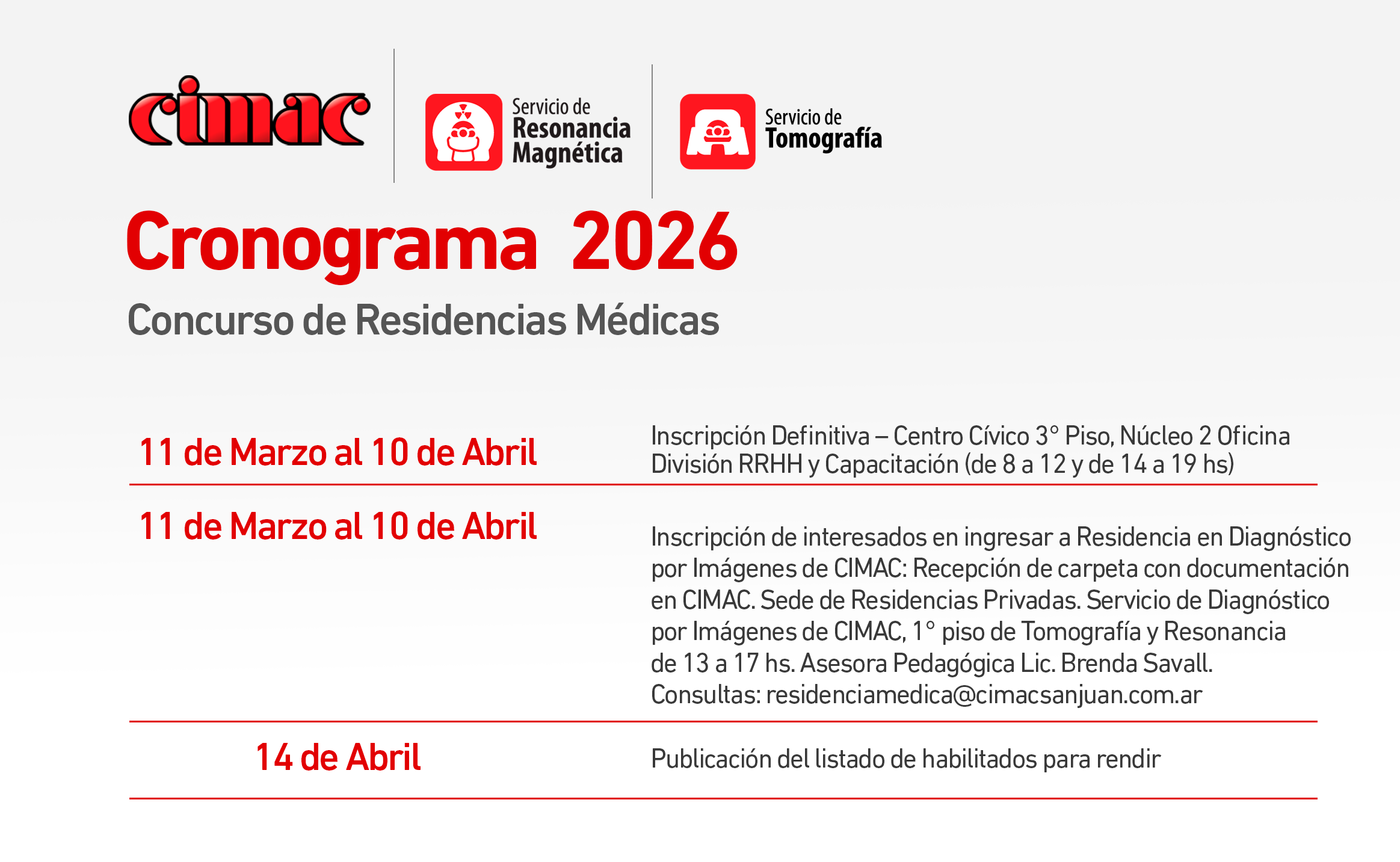 El Centro Integral de Medicina de Alta Complejidad (CIMAC) convoca a médicos interesados en participar del Concurso de Ingreso a Residencias Médicas Privadas 2026, específicamente en la especialidad de Diagnóstico por Imágenes.